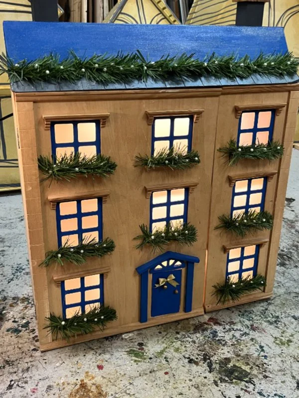 This project was to design and create a Christmas Tree for the Chichester Festival Theatre’s contribution to the Chichester Tree Trail 2024. The intention was to tie into the studio production for that year which focused on the concept of ‘home’. To this end I created a tree which was composed of homes of all types, using reclaimed doll houses and some purpose built homes as well. I wanted every child that walked by the tree to recognise their version of home within it, and therefore ensured that everything from large houses to blocks of flats were displayed. Working with a team of scenic artists I decorated the homes with Christmas lights and displays, and we lit each home internally so the entire tree glowed once darkness fell.